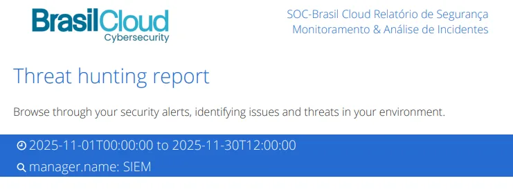 O relatório sempre especifica o intervalo de tempo analisado (ex: de 2025-11-01 a 2025-11-30) e o nome do gerenciador de SIEM (ex: SIEM)