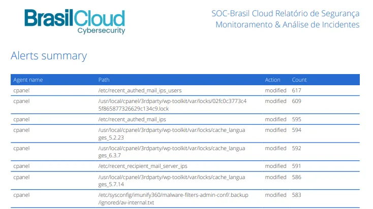 3. Monitoramento FIM Crítico: Verifique o relatório FIM (File Integrity Monitoring) no o agente para confirmar se as modificações em arquivos de configuração do cPanel/Wordpress Toolkit (ex: /usr/local/cpanel/3rdparty/wp-toolkit/var/locks/...) ou de segurança (ex: Imunify360) eram esperadas.
