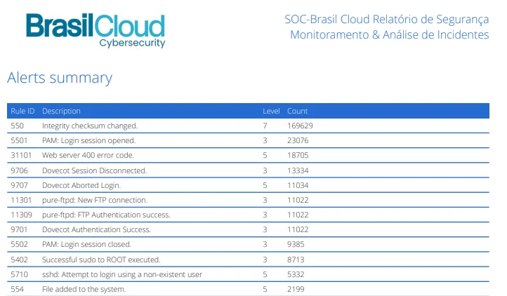• Níveis Intermediários (5, 6, 7): Indica tentativas de acesso não autorizado ou alterações importantes. Eventos Level 7, como Integrity checksum changed, indicam que um arquivo monitorado foi modificado.