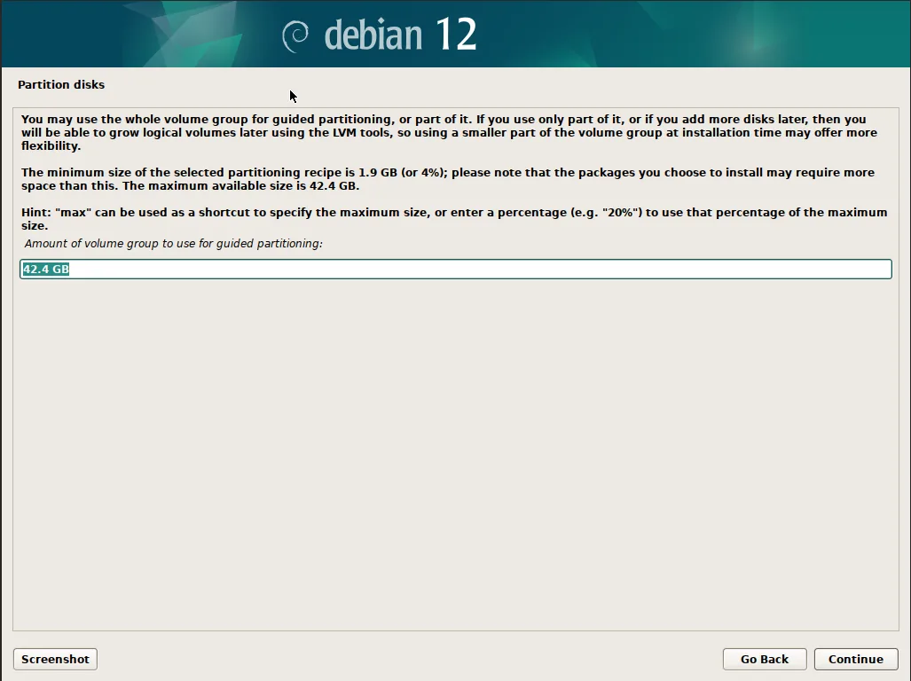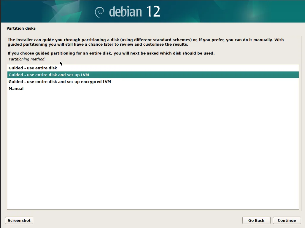 Na configuração do disco escolha a opção com disco completo e LVM;