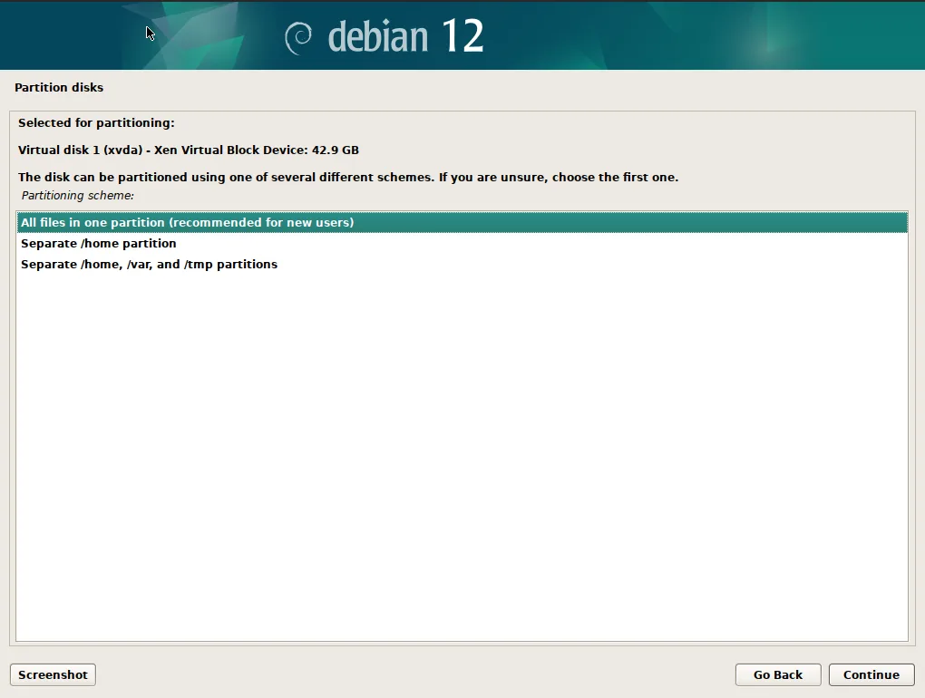 Escolha a primeira opção com todos os arquivos em uma única partição;